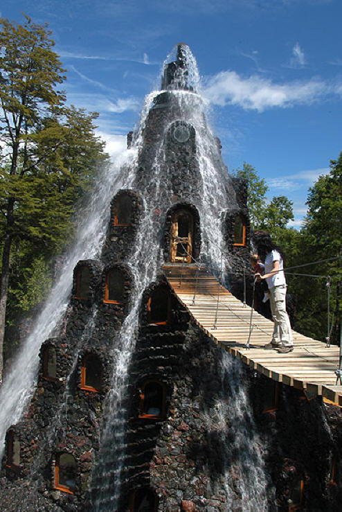 16. Čarobna planina, Panguipulli, Čile. U ovom šarmantnom hotel, sobe su sakrivene unutar stožastog kamenog tornja sa krova koji kaskadni vodopad pada niz prozore. In Utočište za divljinu Huilo Huilo u Los Riosu, Južni Čile, Čarobna planina prvobitno je bila postavljena kao mjesto na kojem su mogli zaustavite prijatelje kreativaca koji uživaju u lovu i ribolovu rezerva.