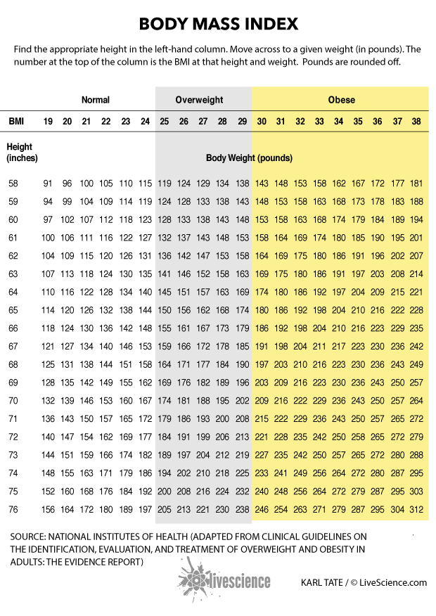 Ova tabela pomoći će vam u određivanju vašeg omjera u visini tijela. a njegova masa – što je veći pokazatelj, više osoba pati od toga višak kilograma. Vertikalna visina je u inčima (1 inč – 2,54 cm), vodoravno – težina u kilogramima (1 kilogram – približno 0,45 kg).