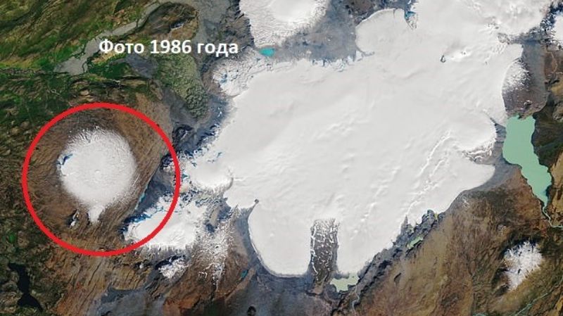 Prva fotografija snimljena 1986. godine prikazuje masivni ledenjak Okayekull. Na drugoj fotografiji vidljiva je samo kamenita površina.