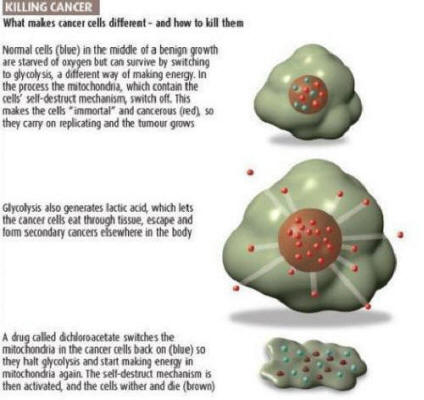 U ljudskom tijelu postoje prirodni lijekovi protiv raka ćelije, mitohondrije, ali da bi djelovale, moraju biti “gurati”. Naučnici su navikli razmišljati o stanicama mitohondrija oštećen i samim tim neefikasan protiv raka. Stoga umjesto toga, usredotočili su se na glikolizu, što je manje efikasan i razorniji za tijelo. U borbi protiv raka proizvođači su se oslonili na metodu glikolize. Međutim metoda Primjena dikloroacetata se oslanja na mitohondrije; droga “Probudi” ćelije koje počinju da se bore protiv raka ćelije.