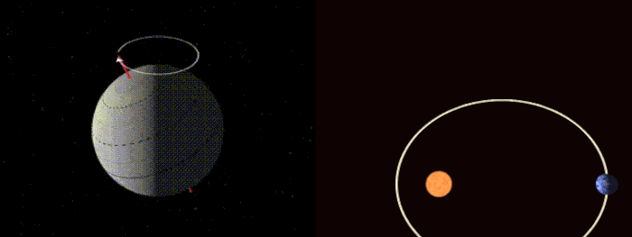 Precesija centrifuge (lijevo) i orbitalna precesija (desno). (Robert Simmon / NASA; WillowW / Wikimedia Commons).
