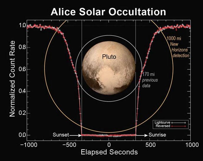 Na grafu: na određenoj udaljenosti od planete, broj svjetlost primljena Alice-spektrografom počinje naglo smanjivati, jer molekulski azot atmosfere Plutona neke apsorbuje dio padajućeg solarnog toka. Kad se približavate površini patuljastog planeta, intenzitet svetlosti je još smanjen oštriji, očito zbog intenzivne apsorpcije solarnog toka molekuli ugljovodoničnih gasova iz atmosfere Plutona.