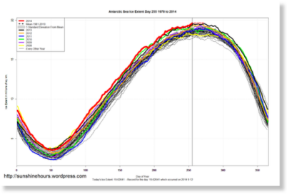 Razvija se anomalija povezana s povećanjem južne hemisfere morskog leda, izvještava sott.net 13. rujna 2014 na ovom mjestu postavili apsolutni rekord za područje morskog leda momenat (bar za satelitsku eru, jer nismo imamo podatke o onome što se prije događalo). Izdanje sunshinehours piše: Ledeno područje Antarktičkog mora 13 Septembar 2014. iznosio je 1.111.000 kvadratnih metara. km, što premašuje veličinu onoga što je bilo u periodu 1981–2010