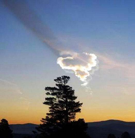 Na Sl. 5 je data fotografija šljunka u završnoj fazi snimanja rasejanje. Na slici se jasno vidi da je poprimio tamnu boju. Ovo ukazuje da je frakcija pare oblaka isparila, i ostali su samo mikrosfere – smrznute kapi taline meteoritna supstanca. Velike kutne dimenzije tamne petlje tako ukazuje na njegovu impresivnu masu. Ukratko, evo jasno predstavljeno u šta se na kraju okrenulo Čeljabinsk meteorit.