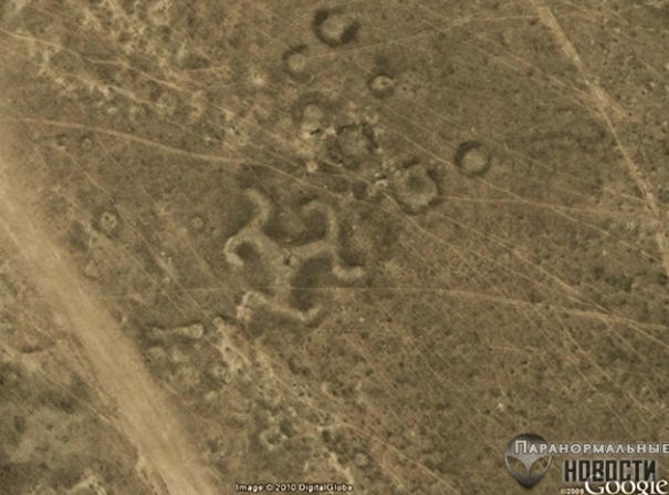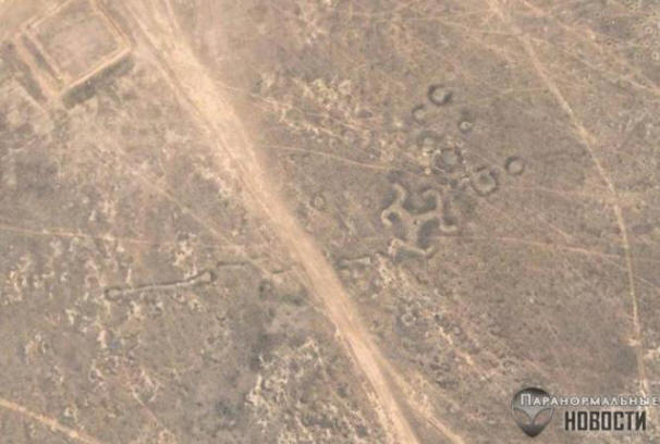 Takozvani kazahstanski geoglifi uočeni su još 2007. godine u slikama iz svemira “Google Earth”. Posebno me impresionira ogromno tro-gredna svastika promjera 90 metara.