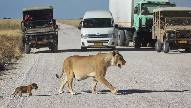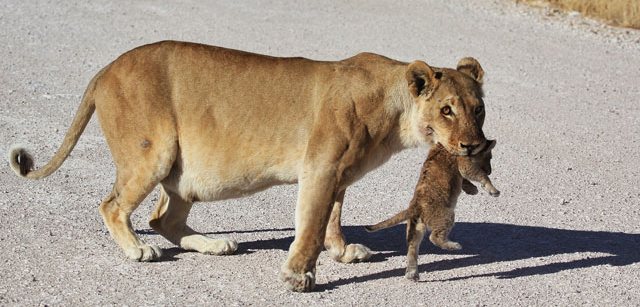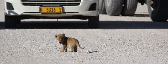 Automobili su bili prisiljeni da se zaustavljaju, kao što su ljudi primijetili lavica i mladunče koji pokušavaju preći stazu. Međutim kada životinje su odvele na put, nesvjesni lav se zainteresirao automobili – radoznalost je zauzela. Majka se morala vratiti i uzevši mladunče mačjeg lava za vrat, nosi ga do rubnika zubi – daleko od zaprepaštenih, pa čak i pomalo uplašenih ljudi.