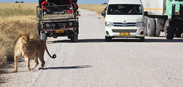 Ove jedinstvene snimke snimio je vozač automobila Matthew Weaver, koji je bio svjedok Nacionalnog parka Etosha Povorka nacionalnog parka u Namibiji propustila je lavicu sa mladuncima preko puta. Vozači su u isto vrijeme promatrali napola dah razvoj gotovo tragične situacije.