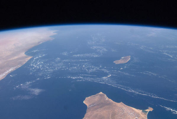 2. Sokotra, pogled s Međunarodne svemirske stanice, 27. aprila 2012 godine. S lijeve strane, obala Jemena, u stvari somalijski rt Guardafuy, obično poznat kao Afrički rog, u centru s desne strane – Ostrvo Sokotra. (NASA)