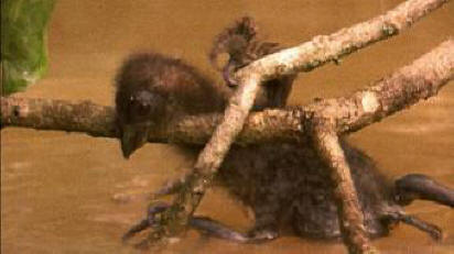 Goacins se u svom načinu života opet pokazao profitabilnim uključiti drevni program razvoja prednjeg dijela opskrbe njihove piliće dodatni uređaj za spas. Međutim, penjanje po granama nije jedini talent pilića goacin. Ako grabežljivac još uvijek sustigne (ili ako su točke okretanja bile) odabrano pogrešno), pilić pluta u vodu … i samouvjereno pliva do obale, ponekad se dugo skrivajući pod vodom, i izlazeći na kopnu, pospremati se na rodnom drvetu kako bi dobio posluživanje hrane od roditelja.