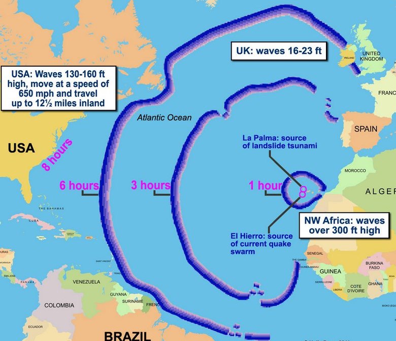 Imajte na umu da je Cumbre Vieja zadnji put eruptirao 1979. godine, zašto su njegove posljedice dobro proučene. Erupcija u pratnji potres i cunami jurili su preko Atlantika do obale Amerika, a glavni udar joj pada na SAD – to su ni manje ni više valovi 20-25 metara visine. Međutim, ako je, prema proročanstvima, vulkan sruši se u okean, a talas može doći čak i do Sjeverne Amerike u Visine 650-1500 metara. I to će biti prava apokalipsa za Sjedinjene Države.