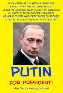 Natpisi na plakatu od vrha do dna: Čuva svoje granice zemalja štiti svoje državljane u inostranstvu; zabranio je u školama gay propaganda; progoni finansijske kriminalce; posadi u zatvori onih koji u crkvama blate; on stavlja interese zemlje iznad vlastitog. Putin na predsjednika!