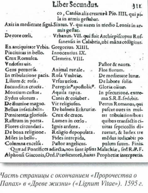 Fotografije iz otvorenih izvora Arnold de Villon nije bio čovjek jednostavno misleći. Oporavivši se od neverovatnog nalaza, izložio se sumnja u autentičnost teksta koji ga je pogodio: nije li ispod stoljetnu prašinu nekakva prevara? Njegovi savremenici – Redovnici benediktinci rado su prihvatili proročanstva koja su se već ticala prošli događaji. Ali veliko je pitanje: kako je crkvena zajednica odnosiće se na deo koji sadrži predviđanja o dolasku događaji? Uostalom, Malachi je umro prije pet stotina godina, njegovo ime je skoro zaboravljeno, i kler, čak i ako su mislili o njemu, onda u vezi s njegovim neobičnim pogleda. U očima Katoličke crkve njegove su se aktivnosti nosile sjenka, kao što bi sada rekli, fronta. Dakle, možete li vjerovati otkrivenja ovog sveca koji su posjedovali definiciju papska dominacija, što odgovara latinskom “priroda je izopačena” ?! Međutim, dva argumenta uzdrmala su Villonove sumnje. Krajem 16. vijeka kad je otresao prašinu s posla Malahija, borba u Evropi jedva je zamrla s hereticima za koje su optuženi vjerni sljedbenici papinstva perverzija istinske vjere. I u rukopisu je Villon pronašao riječi, predviđajući ovu borbu pet vekova pre pravih događaja! Drugi argument je bila aforistički formulisana budućnost. Od 78. pape – Lava XI., O kojem bi Arnold de Villon mogao prosuđivati savremeni. U proročanstvu Malahija ovaj se papa zvao “Čovek voda. “Leo XI vladao je vrlo kratko – ne više od mjesec dana, ali prema Biblije, voda – simbol nesigurnosti, kratkog trajanja … U pet godina nakon što je Arnold de Villon otkrio Malahijski rukopis, objavio je knjigu posvećenu njegovom nalazu – „Proročanstva o Papah. “Međutim, katolički Rim nije podržao ovu publikaciju i otkriće monaha ostalo je zaboravljeno mnogo godina. Predviđanja malahija Sada, nakon nekog vremena, radoznalo je pročitati karakteristike Malachija Pape, koji su predvodili katoličko stado. Dakle, o papi Urbanu VIII (prva polovina 16. vijeka) svetac je rekao: “Lily and rose”. Ovo formula označava glavni događaj na evropskom vjerski i politički život tog razdoblja – pomirenje Engleza Protestanti, čiji je simbol bila ruža, s Francuzima Katolicizam, čiji je simbol ljiljan. Pomirenje se dogodilo sklapanje braka kralja Karla II i Marije Antoanete, kćeri Henrika IX.