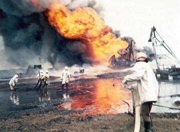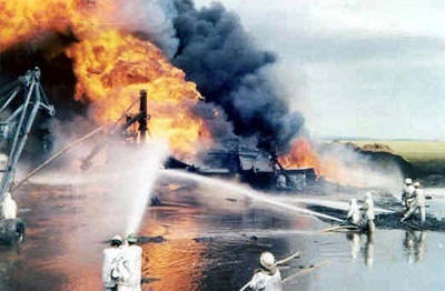 U 14:40 eksplodirao je jedan od zapaljenih spremnika (br. 17). vatra je buknula u kojoj je u nekoliko sekundi živ ljudi na njegovom putu su izgoreli. Mnogi nisu ostali ostaci. Val je stigao do suprotne obale, gde je takođe ljudi su bili povrijeđeni. Nafta se prolila po površini rijeke. Sa strane se činilo da i zemlja i voda gori.