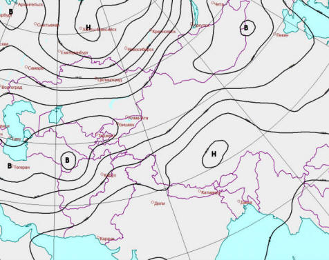 Fotografija iz otvorenih izvora Sputnjik “Aqua”, 13.:45 GMT Januar 2013. © MODIS | NASA Uzrok olujne prašine bio je podela azijske anticiklone u dve jezgre. Glavni centar zadržali se nad Mongolijom, uz blagi pomak prema jugoistoku, i druga, samo nešto manje moćna, pojavila se nad Iranom. Vremenska karta za 06:00 GMT 16. januara 2013. © Gismeteo On je stvorio veliki gradijenti atmosferskog pritiska između hladnog kontinenta i tople vode Arapskog mora. Želeći to nadoknaditi razlika, hladan kontinentalni zrak velikom brzinom žurio na jug, dižući se u pustinji Irana, Afganistana i Pakistana prašine oluje.