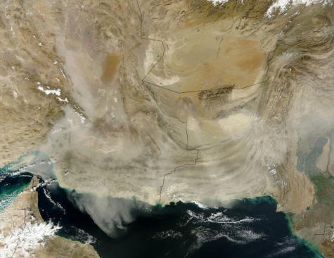 Sredinu januara obilježila je velika olujna prašina koja je zahvatila zemlje jugozapadne Azije, koje se šire do Arapskog mora i stoga posmatrano čak i iz svemira. Snažan vjetar tipičan za ovog vremena, u atmosferu je podigao tonove prašnjavog peska, što je zasjenilo nebo i uvelike je pogoršalo kvalitet zraka.
