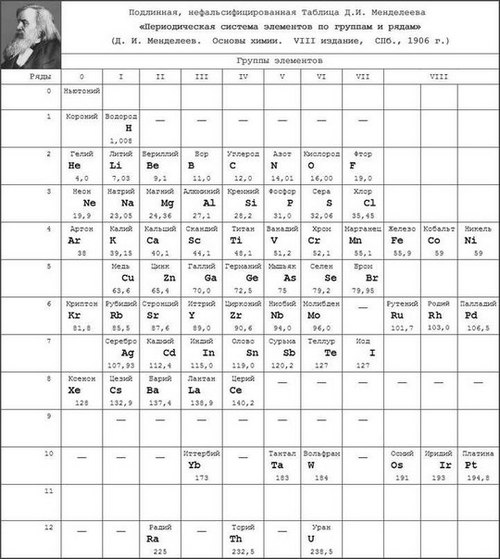 To je ono što je oduševilo javnost, kao što mnogi znaju da je u svim modernim udžbenicima hemije iskrivljeno periodična tablica, kao u originalnoj sadašnjosti osnovni element svega u svemiru je eter (vidi o ovom videu ispod). Prema nezavisnim učenjacima, u posljednjoj vremenski istinita periodična tabela hemijskih elemenata objavljeno 1906. u udžbeniku “Osnove kemije” (St. Petersburg, VIII izdanje).