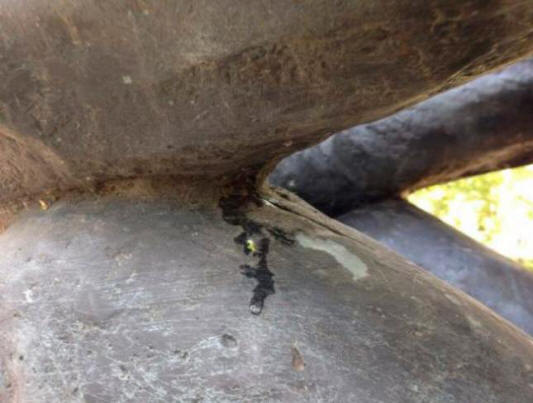 Prilikom sljedeće posjete spomeniku, na vrhu lakta ratniče, primijetila se mala pukotina, a pošto je statua šuplja, tada unutra, posebno u hladnim jutarnjim satima, može se nakupljati unutra male količine vode koja je kapljala na koljeno, stvarajući trajno vlažno mjesto. Pukotina se pokazala tehnološkom šav koji je uvijek prisutan na mjestu spajanja kalupa prilikom lijevanja skulpture. Šavovi su, naravno, kitni i glatki kako se ne bi slomili integritet celokupne površine skulpture, ali u ovom slučaju, šav je bio očigledno slabo zakrpljen ili vajar nije primijetio nedostatak.