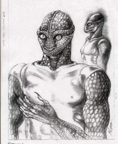 Fotografija iz otvorenih izvora „Vozili smo se oko devet sati, često odmori. U jednom trenutku Michael kaže to bi trebalo zastati na trenutak. Čekali smo da završi naših poslova i u tom trenutku smo odjednom vidjeli da traje dugo, neka figura hoda stazom. Stvorenje je možda imalo oko 6 stopala visoka, bio je vrlo mršav i imao je nespretnost hod, poput majmuna … ili bolesna osoba, gotovo robot “, – rekao je novinaru. “Prestao je i imao vizual kontakt sa mnom i to sam mogao jasno vidjeti. Oči su nekako nalikovale zmije, ali sa crnom i žutom prugom na sredini oka. Imao je zelene i crvene linije na licu i glavi. Crvena boja je imala pijesak nijansi u pustinji. A čini se da i koža stvorenja imao je peščanu teksturu. Nosa nije imao, samo dve rupe. Nisam mogao da vidim uši ili kosu. Imao je crvena usta, to je bilo Čini se kao da je oko njega krv. Ali nije izgledalo krvarenje, izgledalo je kao neka vrsta uzorka. To me podsetilo kameleon, ali stvorenje je takođe bilo kao čovjek. ” stvorenje nalikuje standardnom gmizavcu