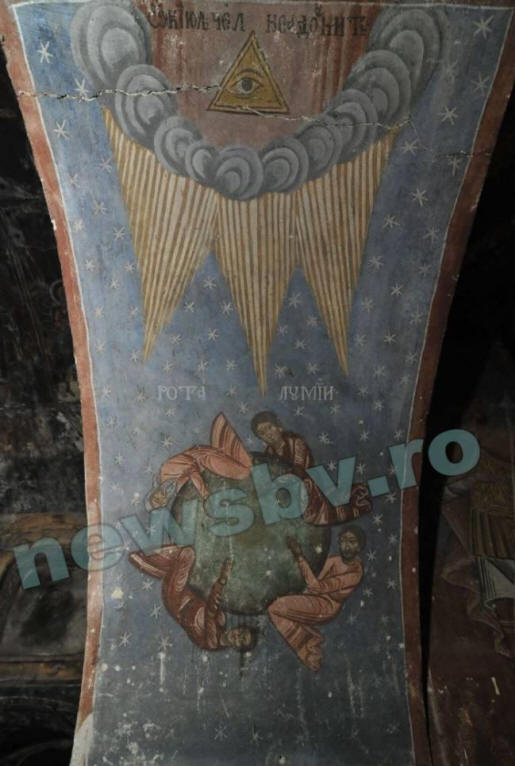 U rumunskom gradu Brašovu u kapeli pravoslavne crkve Sveti Nikola, izgrađen 1495. godine, otkrio je freske sa scene Apokalipse. Prema “Novoj regiji” s pozivom na rumunsko izdanje News Brasov, u ovom hramu postoji mjesto gdje decenijama nije bilo nijednog turista. Na zidovima i nosači kapele prikazuju najmanje 13 scena iz Apokalipse. Jedan od freske, koje se nisu mogle prethodno dešifrirati, imaju upečatljive sličnosti snimcima iz savremenih dokumentarnih filmova o predviđanja za 2012. – sa solarnim bljeskovima i pomakom Zemljini magnetni polovi. Slike su nastale 1737. godine slikar ikona George Keep i njegov brat Gregory, o čemu Natpis na ćirilici potvrđuje autora i datum. Trijem je slikao sin Gregory John, koji je slikao scene iz biblijskog otkrivenja “, rekao je lokalni sveštenik Vasily Oltyanu. Najinteresantnija freska nalazi se na podršci kapeli. Zove se Kotač svijeta i pokazuje rotaciju Zemlje. oko sunca, koja se provodi uz pomoć svetaca. Sunce unutra u sredini je jednakostranični trokut sa “svevideće oko”, usmerava smrtonosne zrake prema Zemlji. At ovo sveci pokušavaju pomaknuti planetu vertikalno, kao kao da žele da je okrenu. Ova scena je povezana sa teorija promjene magnetskih polova Zemlje.