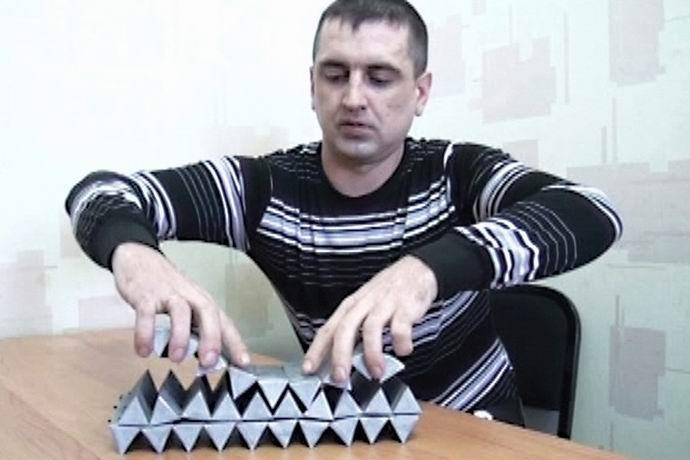 Korištenje minijaturnih metalnih zagonetki, ruski Novinarima je pokazao kako će njegov izum funkcionisati. Struktura će se sastojati od betonskih blokova u obliku piramide, povezane posebnim bravama. Kad premaz bude opterećenja, zagonetke se počinju smenjivati, u isto vreme povećava snagu ceste i stvara izlazne kanale za kiša i otopljena voda. U ovom slučaju veći će biti pritisak Što se više građevine nalazi, više će se zbijeno tlo odozdo.