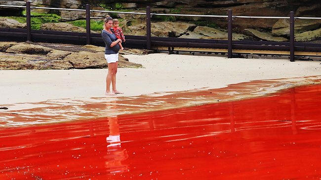 Pojava se mogla vidjeti i između plaže Bondi i Plaža Maroubra jutros. Naučnici kažu da je to prirodno pojava je povezana s crvenim algama, što je definirano Vremenske prilike mogu se vidjeti na tom području. Obje plaže su bile zatvoreno dok vlasti provode istraživanje vode. Jezero pocrveni krv, ali ovdje nije ništa apokaliptično