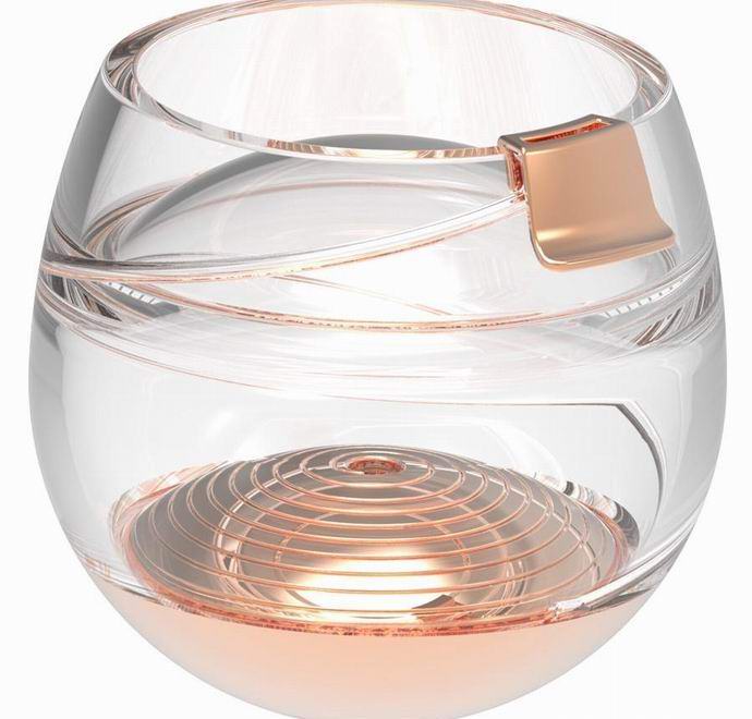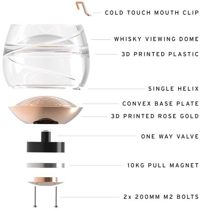 Rezultat je proizvod napravljen od izdržljive plastike na bazi u ružičastom zlatu, što za razliku od drugih metala nije u stanju pokvariti ukus viskija. Piće je gurnuto niz čašu koristeći konveksnu bazu, nakon čega se diže pomoću spiralne cijevi smještene uz rub kapaciteti. Viski dopire do usnika napravljenog od istog ružino zlato i hladan napitak.