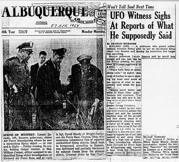 24. aprila 1964. na periferiji novog meksičkog grada Socorro, koji se nalazi sat vremena južno od Albuquerquea, dosadio mu je rutinski dežurni narednik policije Lonnie Zamora. Do kraja smjene preostala su mu još dva sata i čak mu je bilo drago kad skretanje činilo škripanje guma, plavog Chevroleta.