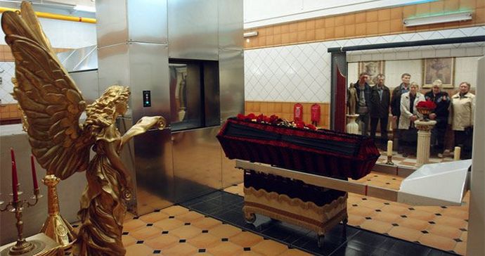Tokom 1996. godine, tokom neke permisivnosti u zemlji, Petersburška televizija prikazala je direktan izvještaj iz krematorijuma. Vrhunac ove emisije, koju su rijetki vidjeli (prošla je popodne i nikad se više nije ponovilo), to je postalo glave pokojnika priključeni senzori elektroencefalografije radi ispitivanja moždana aktivnost u vrijeme kad leš bude poslan u pećnicu.