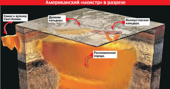 Mount St. Helens – aktivan, može se povezati s kalderom vulkan smješten u zapadnom dijelu Sjedinjenih Država 88 kilometara od Portlanda – glavni grad Oregon. Prema sondiranju koje koju je proveo Graham Hill sa novozelandskog Instituta za Zemlju i Nuklearno istraživanja, a ispod Mount St. Helensa su ogromne šupljine rastaljeni kamen koji se proteže u jednom smjeru na 50 kilometara, do drugog – za 70. S relativno uskim kanalom, koji Sada ide od utrobe do vulkana, još ih je nekoliko povezanih. I radije Ukupno se sistem prostire na Yellowstone Caldera.