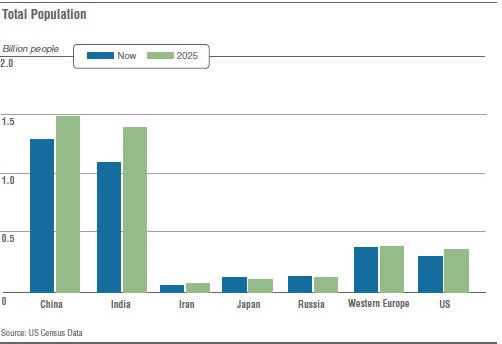 Fotografija iz otvorenih izvora Nacionalnog obavještajnog vijeća Sjedinjenih Država napravio prognozu u kojoj je identificirao glavne faktore i ključne procesi koji mogu odrediti buduće događaje. At pripremajući prognozu, Vijeće je pomoglo istraživački centri, konsultantske firme, naučne institucije. Stotine stručnjaka radi i ne radi vlada, kako u SAD-u tako i izvan zemlje, usvojila je učestvovanje u izradi prognoze. Prema prognozi, do 2025. godine ne ostaće jedinstvena “međunarodna zajednica” koja se sastoji od nacionalne države. Moć je više raspršena između novih igrača koji igraju po svojim pravilima, kao i rizik da će tradicionalni zapadni savezi oslabiti. Mnoge će države privući vjerovatnije kineski model razvoja, nego zapadni modeli političkog i ekonomskog razvoja. takva tranzicija bi ojačala države poput Rusije, koja žele izazvati zapadni poredak. SAD će ostati jedine zemlja koja je u snazi nadmašena drugima, ali njihovoj dominaciji oslabiće. Opadajuće ekonomske i vojne mogućnosti mogu primorava SAD na brojne složene kompromise između prioriteta unutrašnja i spoljna politika. Potreba za SAD su u Srednjoj Evropi djelovale kao regionalni stabilizator Istok, iako će biti druge vanjske snage – Rusija, Kina i Indija igraju veću ulogu nego čak i danas. Terorizam vjerovatno neće izblijediti 2025., ali bi se njegova atraktivnost mogla smanjiti ako nastavljen je ekonomski rast na Bliskom Istoku i nezaposlenost među mladima odbio. Upast će uobičajene tehnologije ruke teroristima koji su aktivni. Ako su cijene nafta i plin ostat će visoka, državna snaga glavnog izvoznici poput Rusije i Irana će skočiti, BDP Istovremeno, Rusija može izjednačiti BDP Velike Britanije i Francuske. At Rusija ima potencijal da postane bogatija, jača i više u 2025 samopouzdana ako ulaže u ljudske resurse, proširit će i diverzificirati svoju ekonomiju i integrirati se u svijet tržište. Ne očekuje se da se druge države uzdižu nivoa Kine, Indije i Rusije i malo je vjerovatno da će ponoviti skokove ovih zemalja. Ostale zemlje će zaostajati još više u ekonomskoj sferi. Okrug Podsaharska Afrika ostat će najugroženija ekonomskom kolapsi, napetosti u društvu, građanski sukobi i politička nestabilnost. Do 2025. godine prihod mnogih zemalja Latinska Amerika će porasti na prosečni nivo, ostale države, posebno kao što su Venecuela i Bolivija za promatrani period, ostat će iza sebe, a neki će poput Haitija postati još siromašniji i će još manje odgovarati. Sveukupni latinica Amerika će zaostajati za Azijom i drugim brzorastućim regiona u smislu ekonomske konkurentnosti. In narednih dvadeset godina Azija, Afrika i Latinska Amerika mogu računati na rast čitavog stanovništva; na zapadu će biti povećanje manje od tri odsto. SAD će biti izuzetak u regionu starenje stanovništva u razvijenim zemljama kako opstaju povećanje nataliteta i imigracije. Vjerovatno će porasti broj migranata koji se žele prebaciti iz nefunkcionalnih u relativno povoljne zemlje. Stanovništvo u Kini, Indiji, Iranu, Japan, Rusija, zapadna Evropa i Sjedinjene Države prema rasporedu će biti izgleda ovako: