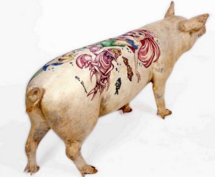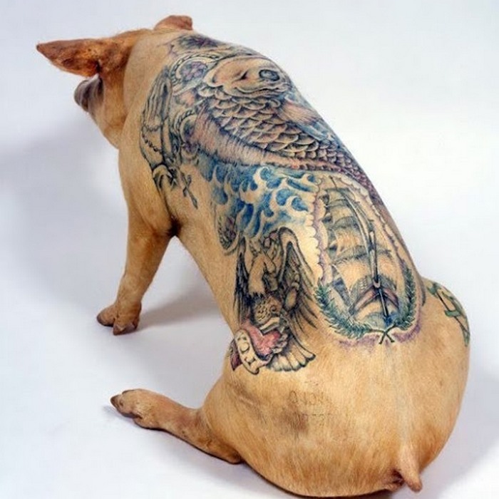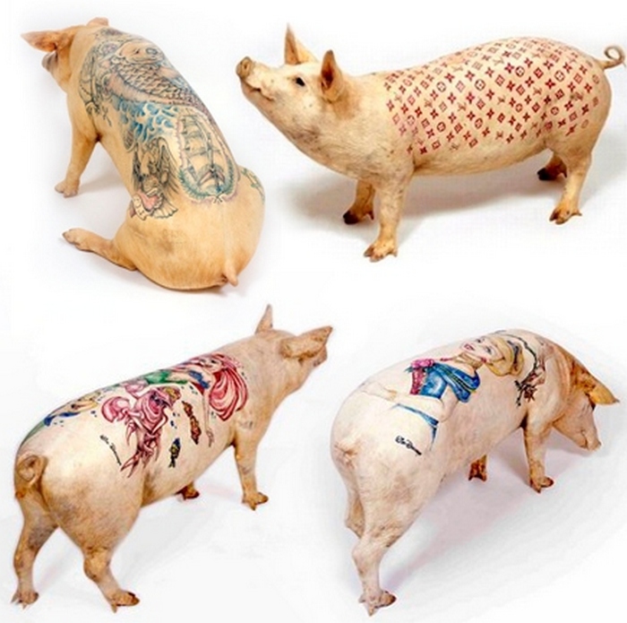 Usput, u studiju Delvois Farm možete kupiti ne samo to tetovirana svinja, ali i “slika” na svinjskoj koži. Takve “umjetnička platna” potražnja je među onima koji nemaju mogućnost držanja svinja u kući, ali iz nekog razloga dobio sam ideju da nabavim tako originalno delo umjetnost. Postoje i neka druga odstupanja od pravila. Tacno tetovaža na ljudskom tijelu, tim Wim Delvoy-a ne vježba.