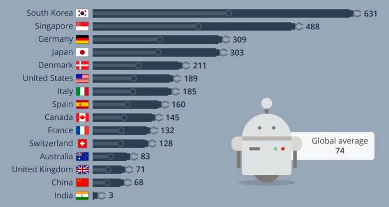 Štaviše, Amerika demonstrira 84 robota na 10 hiljada zaposlenih, Evropa – 99, Azija – 63. Međutim, najveća stopa u ovome plan u jednoj azijskoj zemlji, naime u Južnoj Koreji – 631 robota. Malo Azijski Singapur zaostaje za njim – 488, a ovdje se uglavnom automatizacija je uključena u industriju elektronike (preko 90 procenat).