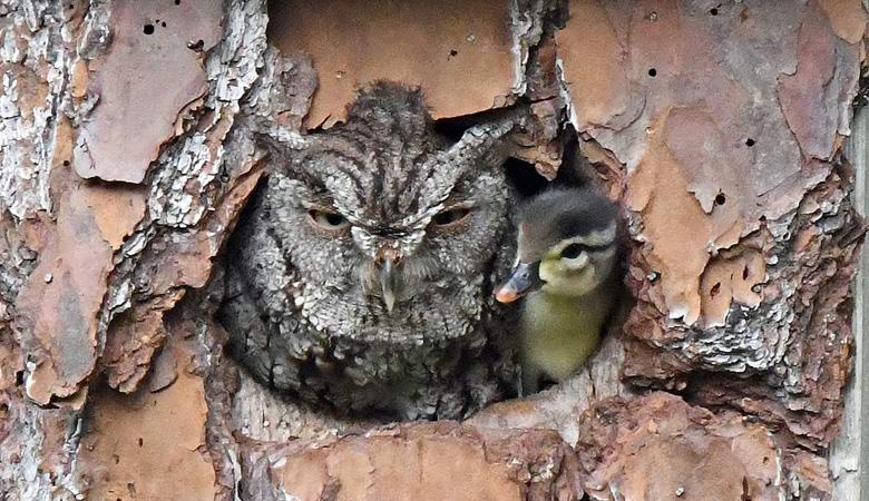 Niko ne zna kako se patka završila u ovom gnijezdu. Mnogi Korisnici World Wide Weba zaključili su da ih je neko bacio noćna ptica patka jaje, a siva lopata izlegla je tuđu pilić. Možda je matična patka bacila svoje jaje ptici drugačije vrste, poput kukavice, na primjer. Svejedno, prema riječima Wolf, koji je neko vrijeme gledao čudne par ptica, sova se očigledno brine o patku kao svojoj kokoši, a ljudi ne vole vrijedi brinuti o njemu. Nije ni čudo što to kažu u prirodi stranci nema dece.