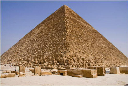 Najpoznatija je, naravno, velika piramida Cheops u Giza. Njegova baza ima dimenzije 230×230 metara. Visina prvobitno je bio 146,6 metara, ali iz nekog razloga izgubila svojih deset metara zida (samo na južnoj strani) sačuvano nekoliko blokova iz sljedećeg reda). Skoro 300 kubičnih blokova krečnjaka, visok oko metar i težak oko pet tona svaka, veruje se da je nestalo već u “našem” vreme.