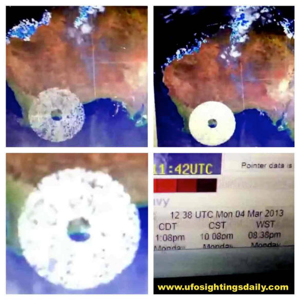 Slika nam pokazuje možda džinovsku majku brod u području najbližem okeanu, a kreće se preko Australije. NLO je okružen oblakom ili plinskom masom, međutim tako je sjajno je što je vremenski radar uspio popraviti Objekt se pojavljuje i nestaje jer element koji skriva NLO promjene u fazi tokom ciklusa od 3 sekunde.