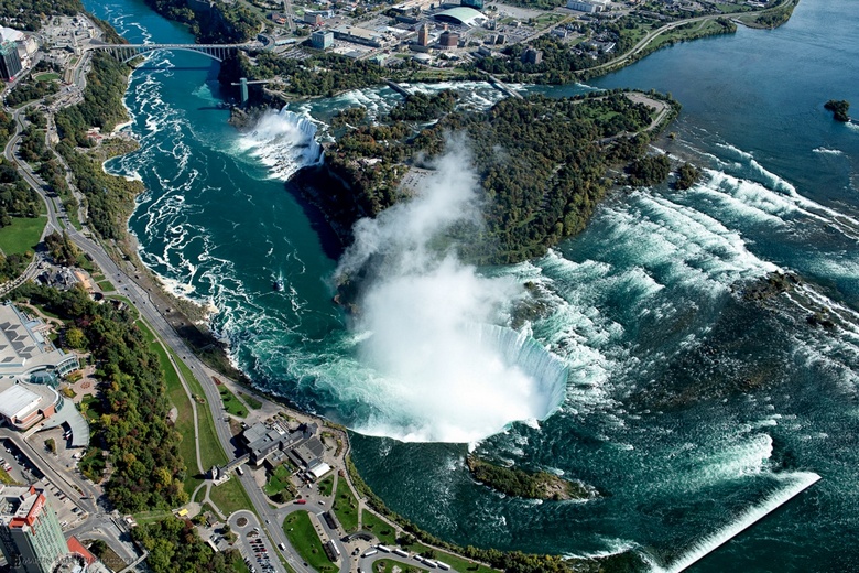 Ako Niagara pogledate odozgo (to dobro pokazuje zračne fotografije), lako možete primjetiti da je to čitav kompleks slapovi širine više od kilometra. Štaviše, postoji širi “Kanadski” dio u obliku potkove kroz koju prolazi do 90 procenta vode, a “američki” dio s otočićem mjeseca i malo Vodopad Fata.