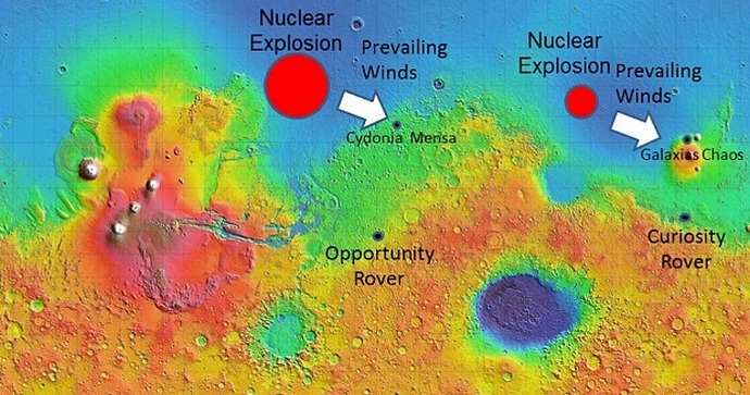 Glavni udarci na planetu izvršeni su u oblastima Galaxias Chaos i Cydonia Mensa. To potvrđuje i rastopljeno staklo Trinitite, nađen na Marsu, potpuno isti kao i ostao nakon nuklearne eksplozije na zemlji. I još jedno objašnjenje za sve to samo ne.